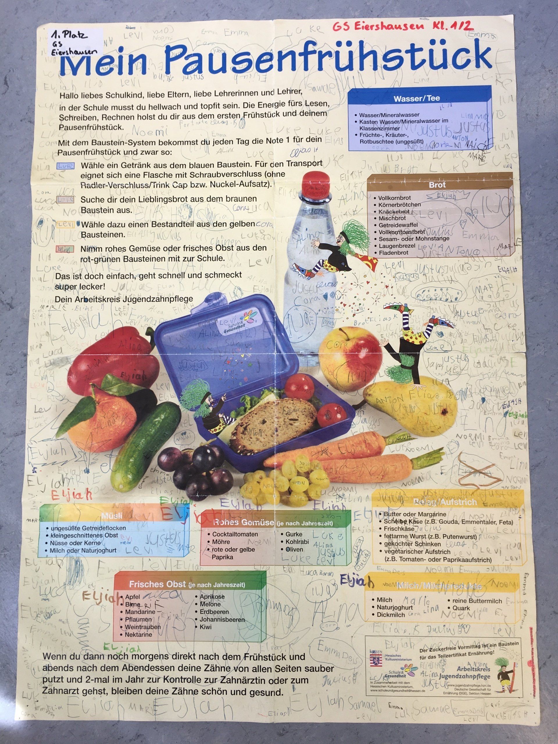 Der diesjährige Gewinner des Frühstückswettbewerbs „Knackig-frisch hält fit – mach’ mit!“ ist die Klasse 1/2 der Eschenburgschule in Eiershausen. Die Schülerinnen und Schüler haben am Wettbewerb teilgenommen und im Zeitraum von Oktober 2019 bis März 2020 besonders auf ein ausgewogenes und gesundes Frühstück geachtet. Ziel des alljährlichen Wettbewerbes des Arbeitskreises Jugendzahnpflege Lahn-Dill ist es, die Kinder für ein frisches Frühstück zu sensibilisieren und ihnen Freude an ausgewogener Ernährung zu vermitteln. Der Wettbewerb wird begleitet von verschiedenen Unterrichtseinheiten, in denen sich die Kinder mit den Themen gesunde Ernährung und Zahnpflege beschäftigen.