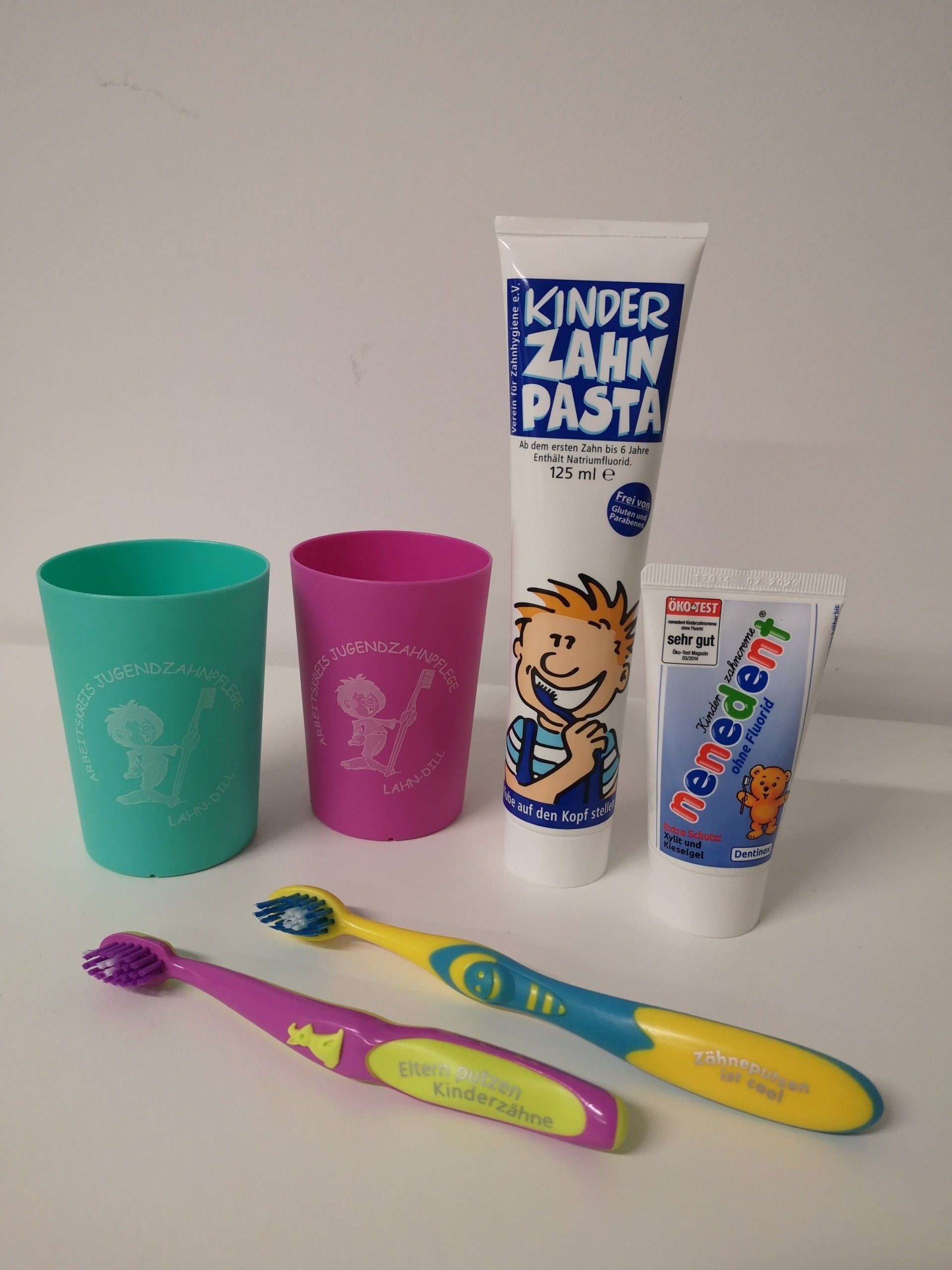 ...wie Zahnbürsten, Zahnpasta und Becher werden nach Bedarf an alle Einrichtungen kostenlos vergeben.